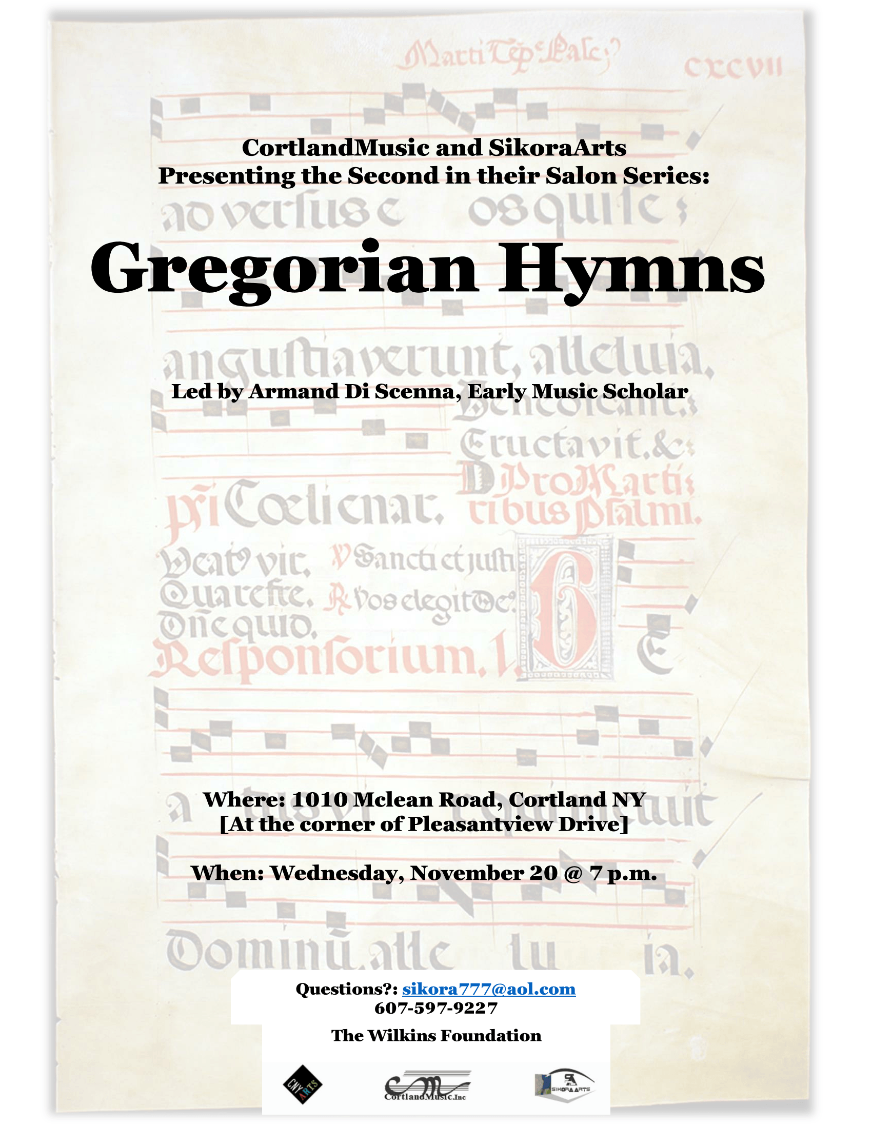 At this gathering, Di Scena will explore the chant, monophonic, or unison, used as liturgical music of the Roman Catholic Church. This type of chant was used to accompany the text of the mass and the canonical hours, or divine office. Gregorian chant is named after St. Gregory I, during whose papacy (590–604) it was collected and codified.